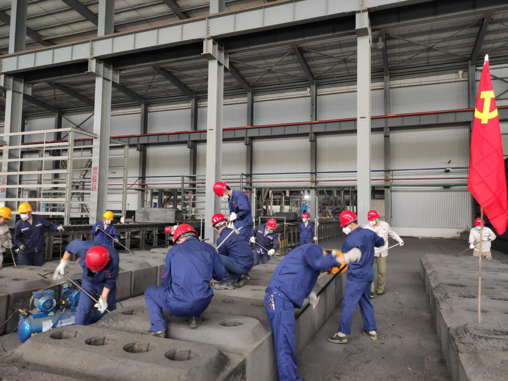 為充分發(fā)揮黨員先鋒模范作用,弘揚奉獻(xiàn)精神,近日,陽極分公司為解決焙燒陽極熟塊填充料粘結(jié)嚴(yán)重、外觀清理速度慢、影響生產(chǎn)進(jìn)度的問題,陽極分公司黨總支結(jié)合生產(chǎn)實際,組織開展了陽極熟塊清焦義務(wù)勞動主題黨日活動;顒幼詮7月21日至24日歷時四天,共計102名黨員干部、管理人員參與了此次活動。 活動中,各支部黨員職工積極踴躍、爭先恐后,按照分工任務(wù)計劃和清焦要求,大家分工協(xié)作、相互配合,對陽極熟塊表面粘接的焦粒及炭碗進(jìn)行了清理,勞動現(xiàn)場熱火朝天,一片繁忙。經(jīng)過四天的奮戰(zhàn),共清理陽極熟塊208塊,極大的緩解了焙燒塊清焦難題,有效保障焙燒車間生產(chǎn)速度和任務(wù)量。 通過此次活動的開展,充分發(fā)揮了廣大黨員勇于擔(dān)當(dāng)、甘于奉獻(xiàn)的精神,進(jìn)一步增強(qiáng)了黨組織的凝聚力和戰(zhàn)斗力,展示了陽極分公司黨員職工團(tuán)結(jié)一致的良好風(fēng)貌。  |