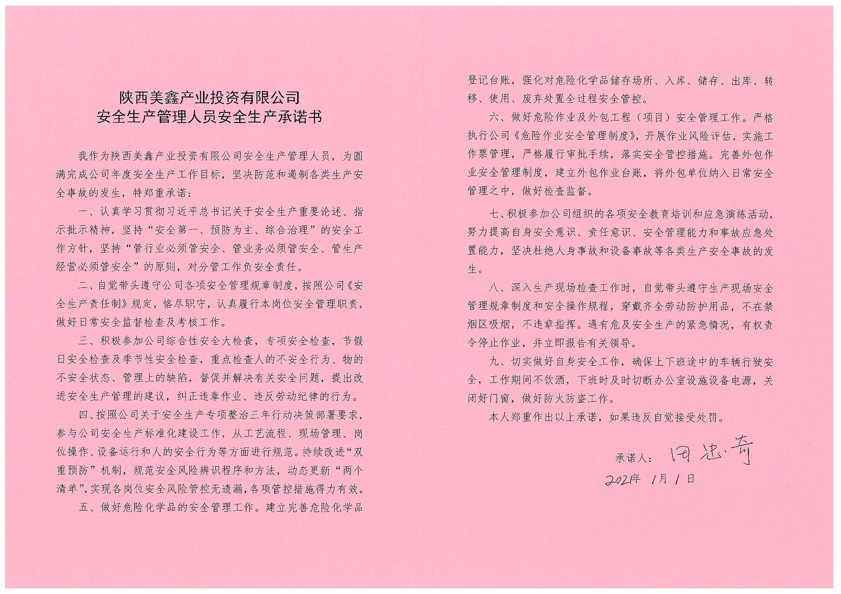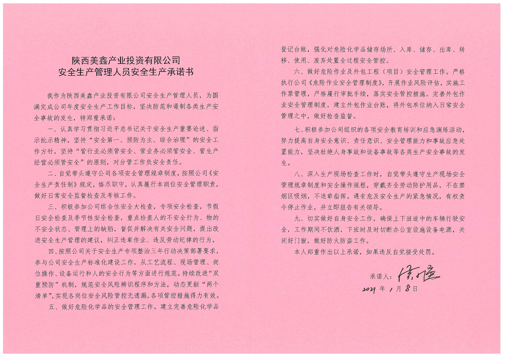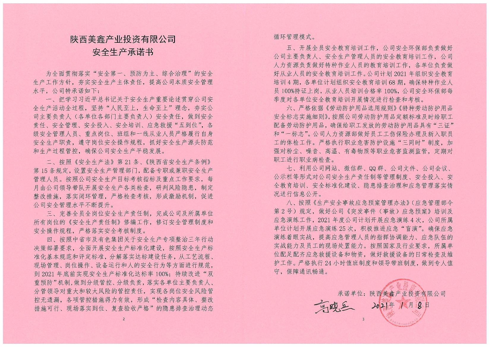 陜西美鑫產(chǎn)業(yè)投資有限公司安全承諾