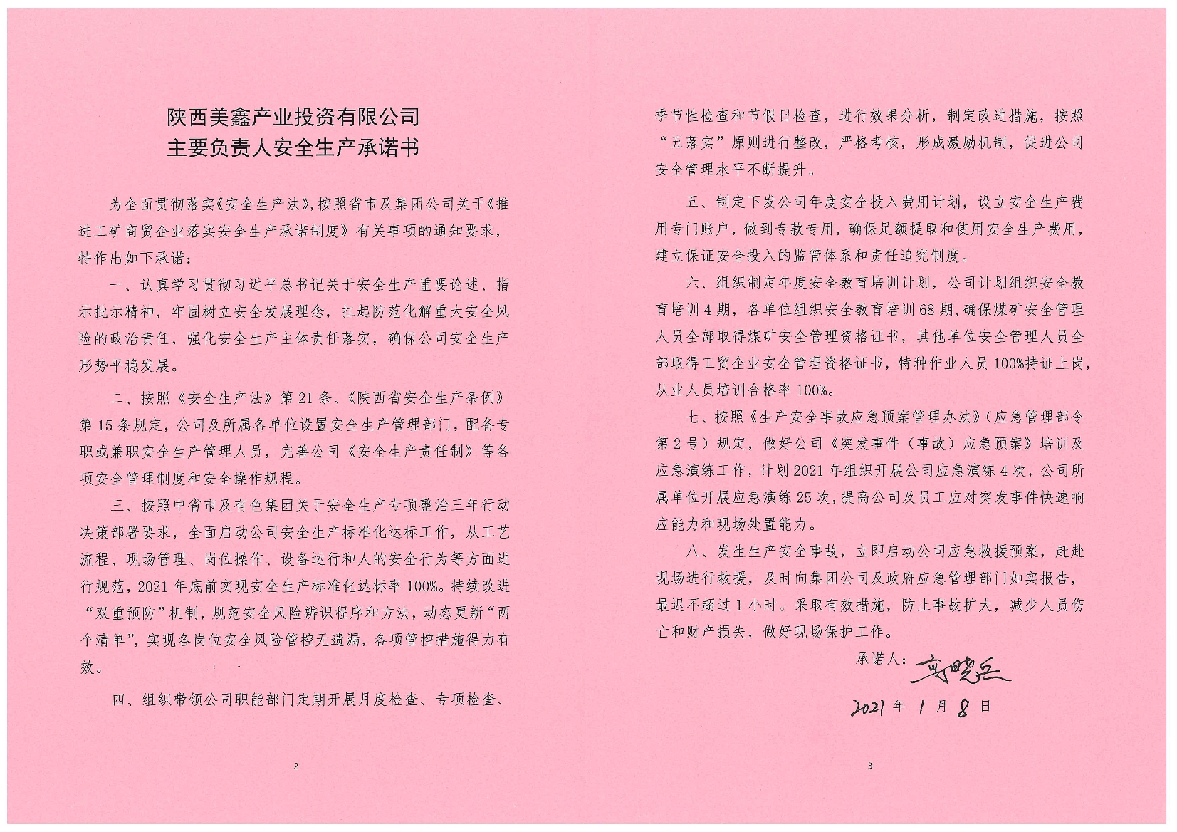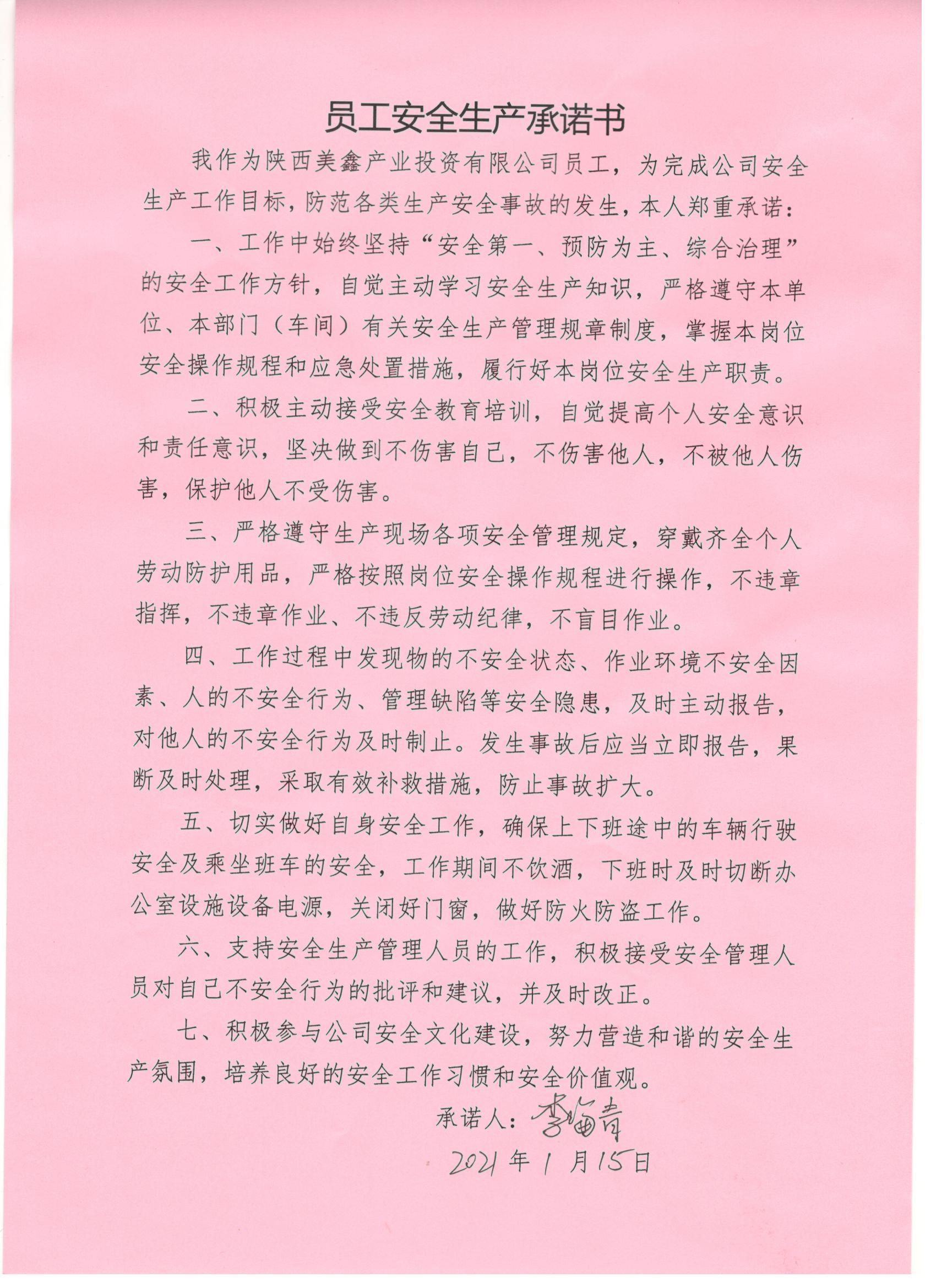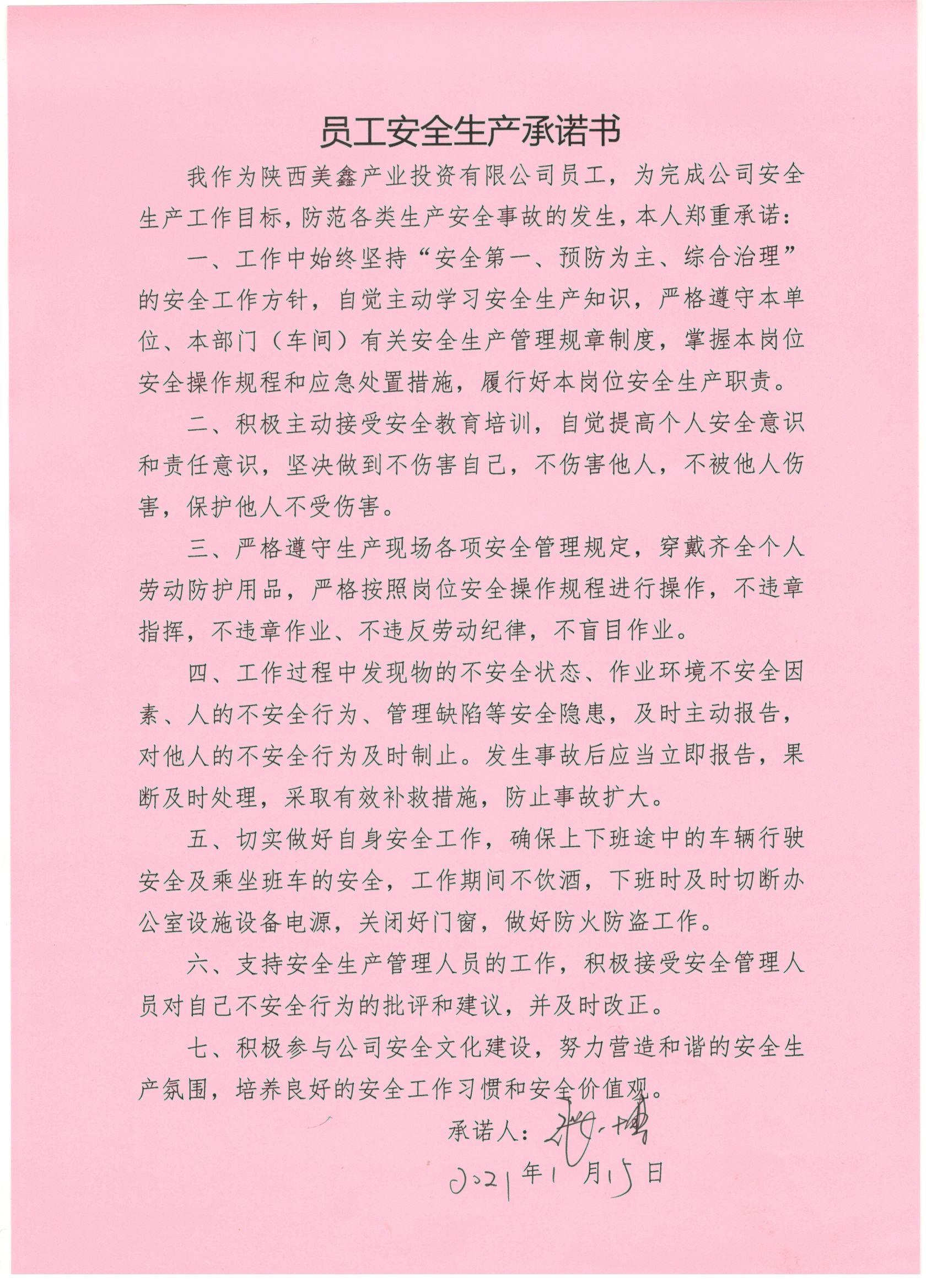 陜西美鑫產(chǎn)業(yè)投資有限公司安全承諾