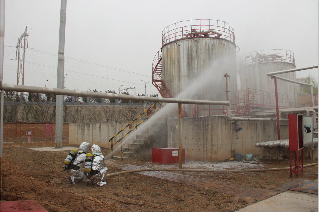 本次演練模擬油庫區(qū)#1油罐供油管道發(fā)生法蘭泄漏事故,引起油罐起火。事故發(fā)生后,油庫值班員立即報告值長,值長匯報公司應(yīng)急值班室,撥打119報警電話。電廠立即啟動火災(zāi)事故應(yīng)急預(yù)案,成立警戒疏散組、滅火撲救組、醫(yī)療救護(hù)組和后勤保障組,迅速開展全方位、立體式救援。