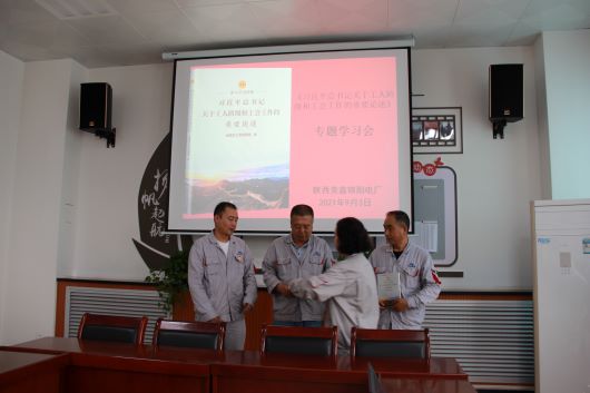 9月3日上午,錦陽電廠召開《習(xí)近平總書記關(guān)于工人階級和工會工作的重要論述》專題學(xué)習(xí)會議。電廠班子領(lǐng)導(dǎo)、中層干部、女工委員參加,電廠黨總支副書記、工會主席劉銀玲主持會議。 會上,劉銀玲首先向與會人員簡要介紹了《習(xí)近平總書記關(guān)于工人階級和工會工作的重要論述》讀本的主要內(nèi)容,領(lǐng)學(xué)了書本的第一章節(jié)內(nèi)容。要求與會人員將學(xué)習(xí)貫徹習(xí)近平總書記重要講話精神同學(xué)習(xí)貫徹習(xí)近平總書記關(guān)于工人階級和工會工作的重要論述結(jié)合起來,切實履行好工會組織的政治責(zé)任。 檢修部主任、檢修工會小組長陳領(lǐng)平表示,接下來要將學(xué)習(xí)貫徹習(xí)近平總書記“七一”重要講話精神和黨史學(xué)習(xí)教育及學(xué)習(xí)《習(xí)近平總書記關(guān)于工人階級和工會工作的重要論述》緊密聯(lián)系起來,深入職工當(dāng)中,強(qiáng)化溝通,進(jìn)一步了解、關(guān)心職工生活、工作中的困難,及時給予幫助,主動做好職工、群眾工作。     女工委員、發(fā)電部化水專工張帆表示,將深刻領(lǐng)悟《習(xí)近平總書記關(guān)于工人階級和工會工作的重要論述》內(nèi)涵意義,接下來將配合電廠工會,多組織形式多樣職工活動,增強(qiáng)職工凝聚力,廣大征集職工意見建議,采納合理化意見,更有效推動工會工作。     就進(jìn)一步做好工會工作,劉銀玲要求:一是各黨支部、工會小組要帶頭加強(qiáng)理論學(xué)習(xí),創(chuàng)新學(xué)習(xí)方式,進(jìn)一步掀起學(xué)習(xí)宣傳的高潮;二是加強(qiáng)學(xué)習(xí)宣傳力度,營造《習(xí)近平總書記關(guān)于工人階級和工會工作的重要論述》學(xué)習(xí)濃厚氛圍,引導(dǎo)廣大職工堅定不移聽黨話跟黨走;三是深刻領(lǐng)會《習(xí)近平總書記關(guān)于工人階級和工會工作的重要論述》的豐富內(nèi)涵、重大意義,更好的武裝頭腦指導(dǎo)實踐、工作,為電廠機(jī)組安全環(huán)保平穩(wěn)運(yùn)行提供保障。 會后,電廠工會為各工會小組組長發(fā)放了《習(xí)近平總書記關(guān)于工人階級和工會工作的重要論述》書籍。  |