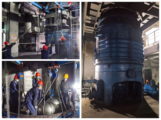 為了保障此次球磨機(jī)換裝工作順利完成,車間多次與設(shè)備廠家溝通交流,制定切實(shí)可行的換裝方案,提前做好現(xiàn)場警戒、腳手架及龍門吊架安裝、配電箱、控制柜停電掛牌以及工器具的準(zhǔn)備等工作,為換裝工作做好充足準(zhǔn)備。8月初,備件如期驗貨進(jìn)廠,由于是首次更換如此的龐然大物,缺乏換裝經(jīng)驗,分公司邀請榆林新材料集團(tuán)相關(guān)技術(shù)人員現(xiàn)場指導(dǎo),車間更是抽調(diào)骨干力量參與此次換裝工作。換裝過程中,現(xiàn)場人員嚴(yán)格按照方案要求,佩戴安全防護(hù)用具,明確職責(zé)分工。生產(chǎn)班組負(fù)責(zé)球磨機(jī)檢修口螺栓拆卸、內(nèi)部粉料殘碎件清理、斷絲排查,檢修人員負(fù)責(zé)磨環(huán)、鋼球拆裝工作。面對上磨環(huán)重達(dá)4.5噸、下磨環(huán)重達(dá)7噸、五個鋼球每個2噸多重的吊裝難題,作業(yè)人員集思廣益,克服困難,最終在大家的通力配合下,僅用5天時間就完成換裝工作,經(jīng)過半個多月的帶負(fù)荷運(yùn)轉(zhuǎn),各項指標(biāo)顯示正常,至此,球磨機(jī)換裝工作取得圓滿成功。