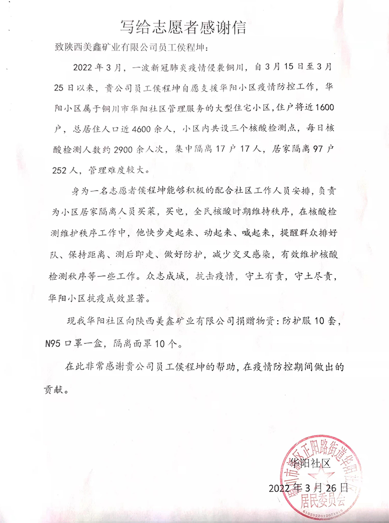 3月14日,“新冠病毒”疫情的突襲,使整個銅川按下了暫停鍵。防控形勢驟然緊張,防控工作壓力驟增。關(guān)鍵時刻,公司黨委發(fā)出倡議,號召廣大黨員干部積極發(fā)揮先鋒模范作用,主動投身疫情防控工作,礦業(yè)公司的侯程坤積極響應(yīng)號召,成為眾多“逆行者”中的一員。 “疾風(fēng)知勁草,危難顯擔(dān)當(dāng)”,我為防“疫”出把力。 侯程坤,男,1994年5月1日出生,目前在礦業(yè)公司供銷部從事磅房管理工作。據(jù)了解,疫情發(fā)生時侯程坤正在家中輪休,當(dāng)他得知公司黨委的號召后,經(jīng)與父母短暫溝通后,便立即向當(dāng)?shù)厣鐓^(qū)提出申請,義無反顧的加入到“疫情防控”志愿者隊伍當(dāng)中。在問道他為什么要參加此次志愿者防疫工作時,他淡淡的說到:“在國家危難之際,作為一名國有企業(yè)職工,代表我們企業(yè)為防疫工作出一點力,我感到非常榮幸...” “疫情就是命令,防控就是責(zé)任”,做好每家住戶的防疫工作是我的責(zé)任。 在此次疫情防控工作中,按照當(dāng)?shù)厣鐓^(qū)對志愿者的工作分配,侯程坤同志被分配到銅川市新區(qū)疫情較為嚴(yán)重的華陽小區(qū)工作。作為我市建設(shè)較早的一批小區(qū),華陽小區(qū)有著顯著的特點,小區(qū)大,住戶雜,90%的樓宇目前還沒有安裝電梯,導(dǎo)致防疫工作在物資運送、通知核檢、維護(hù)秩序等工作上增加了不少困難。面對華陽小區(qū)的實際情況和困難,志愿者們勇敢的扛起了責(zé)任,每天天不亮,侯程坤就戴上N95,穿上防護(hù)服趕到社區(qū),根據(jù)工作安排,和大家一起忙碌著。與侯程坤一起工作的志愿者是這樣描述他的,“此次抗擊疫情,小候同志表現(xiàn)得非常出色。在通知住戶核酸檢測上,侯程坤每天天微微亮就開始按樓號通知大家下樓做核酸檢測,維護(hù)秩序。為防止有住戶漏掉,他就一家一戶的敲門通知,做到了人人核酸檢測。住戶做完核酸檢測后,他又開始對小區(qū)住戶需要的生活用品、糧油蔬菜等進(jìn)行分揀,然后馬不停蹄的將物品挨家挨戶送上門。在配送過程中當(dāng)遇到住戶有需求和困難時,他也能及時反饋并積極解決,真是個非常不錯的小伙子!” “隨時待命,勇當(dāng)先鋒”,時刻牢記責(zé)任與擔(dān)當(dāng)。 隨著疫情形勢的逐漸好轉(zhuǎn),銅川市也積極有序推進(jìn)復(fù)工復(fù)產(chǎn)。在此次疫情防控工作中我們要向參與防疫的醫(yī)務(wù)人員、志愿者表示由衷的感謝,是他們用實際行動為大家筑起了一道道健康的“防火墻”,守護(hù)著我們的安全。當(dāng)問道侯程坤在此次“抗擊疫情”中有什么感悟時,他答到:“雖然志愿服務(wù)結(jié)束了,但這次的經(jīng)歷對我來講卻是一次非常難得的錘煉,雖然付出了很多的汗水,但是當(dāng)我看到華陽小區(qū)生活秩序得到穩(wěn)定恢復(fù),自己也受到了華陽社區(qū)的表揚和認(rèn)可時,我覺得一切付出都是值得的。如若有一天,國家、社會和我們企業(yè)再一次需要我,我仍將義無反顧的投身第一線,用實際行動來證明國有企業(yè)職工的責(zé)任和擔(dān)當(dāng)!  |