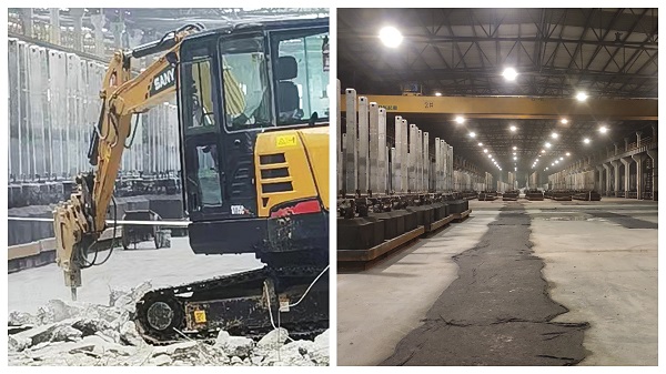 陽極分公司組裝車間裝卸站附近地面由于15T叉車、拖車頻繁行駛碾壓,造成大小坑洼十余處,盡管車間鋪設了厚鋼板對地面進行臨時應急處理,但始終治標不治本,存在一定車輛行駛安全隱患。 為了徹底改善地面環(huán)境,消除此項隱患,車間決定集中對裝卸站周邊等廠房殘缺下陷地面進行修復。為了盡量減少對正常作業(yè)的影響,車間對生產現場進行細致考量核實,最終決定在最大程度利用現有區(qū)域空間的同時,將裝卸站上站工位采取15T叉車人工上線,由人工清理上線后托盤中剩余大塊電解質,隨后將清理后的陽極托盤用于裝成品陽極,并采取3T叉車下線,5T叉車和天車裝盤,最后將裝好的成品陽極送往鋁鎂合金分公司電解車間使用。在地面修復過程中,現場作業(yè)環(huán)境復雜,存在叉車、拖車、天車等交叉作業(yè)情況,車間由專人負責現場安全監(jiān)管,拉起警戒線,劃定風險、安全區(qū)域,確,F場運行安全可控,在車間和施工人員的協調配合下,僅用11天就完成了地面修復工作,經養(yǎng)護后隨即投入使用,車間生產線恢復正常運行。 車間廠房地面修復工作的順利完成,在美化和改善了車間整體環(huán)境的同時,穩(wěn)定和保證了車間正常生產秩序,為鋁鎂合金分公司充足供應成品陽極和電解質破碎料打下了堅實基礎。 |