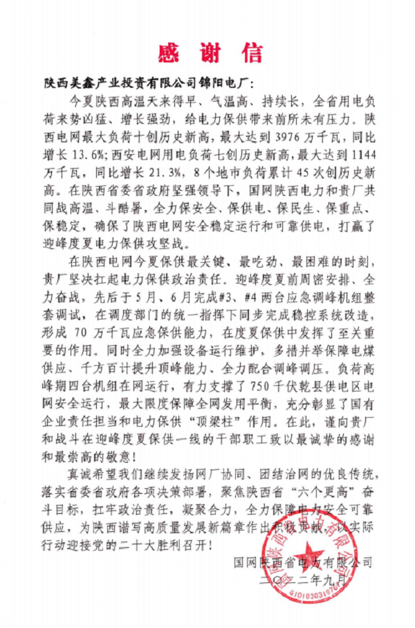 2022年9月,國網陜西省電力有限公司向錦陽電廠發(fā)來感謝信,對錦陽電廠在迎峰度夏期間奮戰(zhàn)一線戰(zhàn)高溫、斗酷暑、保供電的干部職工予以感謝。 為認真貫徹落實上級有關疫情防控、安全生產、電力保供的決策部署,錦陽電廠不懼抗疫保電雙重壓力,科學應對、精準施策,提前制定迎峰度夏、可靠供電及電網安全工作方案,建立用電保障24小時生產現場領導帶班工作機制,持續(xù)強化運行管理,加強設備巡檢力度及頻次,全面提高設備健康水平,為迎峰度夏安全生產打牢堅實基礎。在國網陜西省電力有限公司及美鑫公司的大力支持和關懷下,電廠全體職工及外委單位同心同向、沖鋒在前、攻堅克難、堅守陣地,在做好鋁鎂合金可靠供電的前提下,全面打贏保安全、保供電、戰(zhàn)疫情攻堅戰(zhàn)! 接下來,錦陽電廠將一如既往扛起責任,以昂揚的斗志、堅定的信念,全力保障電力安全可靠供應,以優(yōu)異的成績迎接黨的二十大勝利召開。  |
