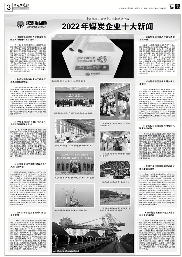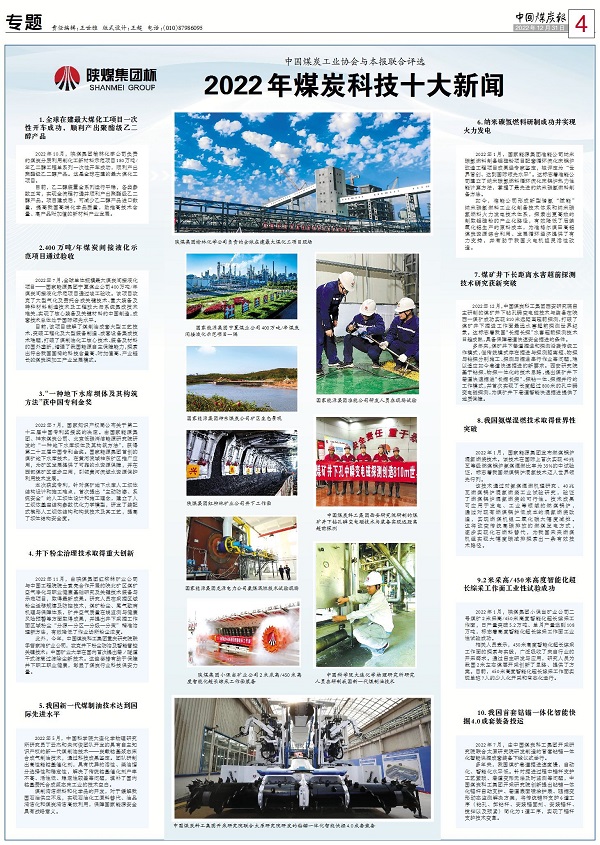 2022年12月31日,中國煤炭工業(yè)協(xié)會與中國煤炭報聯(lián)合評選并發(fā)布2022年煤炭行業(yè)十大新聞、煤炭科技十大新聞、煤炭企業(yè)十大新聞,陜煤集團(tuán)多條新聞獲評入選,展現(xiàn)了2022年企業(yè)發(fā)展多個領(lǐng)域的成績。 其中,2022年煤炭行業(yè)十大新聞第5條《煤炭企業(yè)國企改革三年行動成效顯著》提到:陜煤集團(tuán)形成了“第一議題”制度全覆蓋、董事會應(yīng)建盡建全覆蓋,黨委會前置研究重大經(jīng)營管理事項清單全建立、董事會重大決策部署跟進(jìn)督辦機制全建立的“兩覆蓋、兩建立”工作機制;修訂完善現(xiàn)代企業(yè)法人治理結(jié)構(gòu)等16項改革及相關(guān)制度,外部董事占多數(shù)企業(yè)完成率達(dá)100%。 同時,《全球在建最大煤化工項目一次性開車成功,順利產(chǎn)出聚酯級乙二醇產(chǎn)品》《井下粉塵治理技術(shù)取得重大創(chuàng)新》《2米采高/450米高度智能化超長綜采工作面工業(yè)性試驗成功》入選2022年煤炭科技十大新聞;《陜煤集團(tuán)參與制定的三項化工用煤國家標(biāo)準(zhǔn)實施》2022年煤炭企業(yè)十大新聞,并選用“陜煤集團(tuán)榆林化學(xué)年產(chǎn)180萬噸乙二醇工程打通全流程”新聞圖片。 2022年煤炭行業(yè)十大新聞《煤炭企業(yè)國企改革三年行動成效顯著》:2022年是國企改革三年行動收官之年,各大型國有煤炭企業(yè)紛紛交出優(yōu)異成績單。國家能源集團(tuán)國企改革三年行動主體任務(wù)基本完成,應(yīng)建董事會范圍內(nèi)的508家企業(yè)全部實現(xiàn)應(yīng)建盡建和外部董事占多數(shù);經(jīng)理層任期制和契約化管理更加精準(zhǔn),收入分配持續(xù)向基層一線和關(guān)鍵崗位傾斜。陜煤集團(tuán)形成了“第一議題”制度全覆蓋、董事會應(yīng)建盡建全覆蓋,黨委會前置研究重大經(jīng)營管理事項清單全建立、董事會重大決策部署跟進(jìn)督辦機制全建立的“兩覆蓋、兩建立”工作機制;修訂完善現(xiàn)代企業(yè)法人治理結(jié)構(gòu)等16項改革及相關(guān)制度,外部董事占多數(shù)企業(yè)完成率達(dá)100%。河南能源集團(tuán)國企改革三年行動方案中的164項具體任務(wù)已全部完成,中國特色現(xiàn)代企業(yè)制度更加成熟定型,產(chǎn)業(yè)資產(chǎn)結(jié)構(gòu)更加優(yōu)化,市場化經(jīng)營機制進(jìn)一步完善,企業(yè)自主創(chuàng)新活力更加充足。 2022年煤炭科技十大新聞《全球在建最大煤化工項目一次性開車成功,順利產(chǎn)出聚酯級乙二醇產(chǎn)品》:2022年10月,陜煤集團(tuán)榆林化學(xué)公司負(fù)責(zé)的煤炭分質(zhì)利用制化工新材料示范項目180萬噸/年乙二醇工程單系列一次性開車成功,順利產(chǎn)出聚酯級乙二醇產(chǎn)品。這是全球在建的最大煤化工項目。 目前,乙二醇裝置全系列運行平穩(wěn),各類參數(shù)正常,實現(xiàn)全流程打通并順利產(chǎn)出聚酯級乙二醇產(chǎn)品。項目建成后,可減少乙二醇產(chǎn)品進(jìn)口數(shù)量,提高我國高端化學(xué)品質(zhì)量,助推高技術(shù)含量、高產(chǎn)品附加值的新材料產(chǎn)業(yè)發(fā)展。 2022年煤炭科技十大新聞《井下粉塵治理技術(shù)取得重大創(chuàng)新》:2022年11月,由陜煤集團(tuán)紅柳林礦業(yè)公司與中國工程院院士袁亮合作開展的陜北礦區(qū)煤礦空氣凈化與職業(yè)健康基礎(chǔ)研究及關(guān)鍵技術(shù)裝備與示范項目,取得最新成果。研究人員在采掘區(qū)域粉塵運移規(guī)律及防控技術(shù),煤礦粉塵、尾氣致病機理與保障體系,礦井空氣質(zhì)量在線監(jiān)測與健康風(fēng)險預(yù)警等方面取得成果,并提出井下采掘工作面區(qū)域粉塵“分源—分區(qū)—分級—分策”精準(zhǔn)治理新方法,有效降低了作業(yè)場所粉塵濃度。 此外,今年,中國煤炭科工集團(tuán)重慶研究院聯(lián)手曹家灘礦業(yè)公司,攻克井下粉塵防治及智能管控關(guān)鍵技術(shù);中國礦業(yè)大學(xué)在國內(nèi)首次提出巷/隧道干式濾筒過濾除塵新技術(shù)。這些舉措有助于保障井下職工職業(yè)健康,彰顯了煤炭行業(yè)科技保安力量。 2022年煤炭科技十大新聞《2米采高/450米高度智能化超長綜采工作面工業(yè)性試驗成功》:2022年1月,陜煤集團(tuán)小保當(dāng)?shù)V業(yè)公司二號煤礦2米采高/450米高度智能化超長綜采工作面,日產(chǎn)量突破5.2萬噸、單月產(chǎn)量達(dá)到108萬噸,標(biāo)志著高度智能化超長綜采工作面工業(yè)性試驗成功。 相關(guān)人員表示,450米高度智能化超長綜采工作面的探索與實踐,廣泛吸收了來自行業(yè)的開采需求。通過自主研發(fā)與應(yīng)用,研究人員為我國2米左右煤層開采創(chuàng)新了思路、提供了方案。目前,450米高度智能化超長綜采工作面實現(xiàn)單班7人的少人化開采和常態(tài)化運行。 2022年煤炭企業(yè)十大新聞《陜煤集團(tuán)參與制定的三項化工用煤國家標(biāo)準(zhǔn)實施》:由陜煤集團(tuán)參與制定的《煤化工用煤技術(shù)導(dǎo)則》《商品煤質(zhì)量直接液化用煤》《商品煤質(zhì)量氣流床氣化用煤》三項國家標(biāo)準(zhǔn)于2021年12月31日獲批發(fā)布后,自2022年7月1日起正式實施。這三項化工用煤國家標(biāo)準(zhǔn)實施后,有助于企業(yè)快速找準(zhǔn)產(chǎn)品定位、及時
