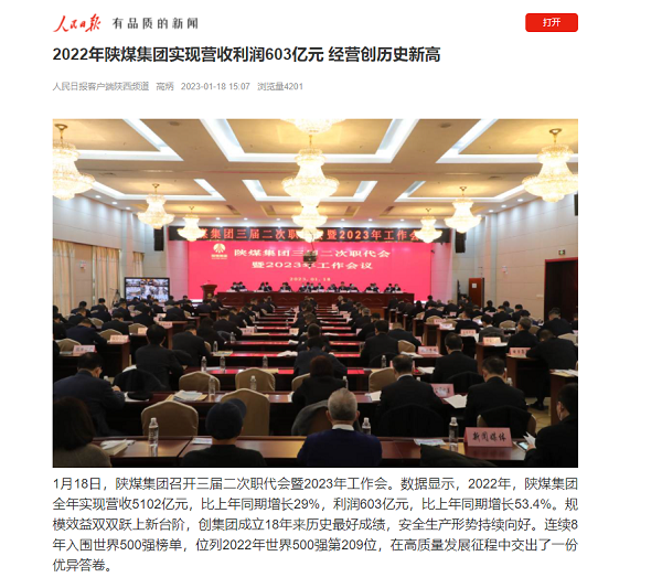 1月18日,陜煤集團公布數(shù)據(jù)顯示,2022年,陜煤集團全年實現(xiàn)營收5102億元,比上年同期增長29%,利潤603億元,比上年同期增長53.4%,創(chuàng)集團成立18年來歷史最好成績。 2022年,陜煤集團各實體產(chǎn)業(yè)板塊緊扣供需實際,積極實施相機調(diào)控,有效實現(xiàn)了提質(zhì)、穩(wěn)量、增效目標。其中,完成煤炭產(chǎn)銷量2.3億噸,各類化工產(chǎn)品產(chǎn)量接近2000萬噸,發(fā)電量突破500億度,粗鋼產(chǎn)量保持在1200萬噸水平,其他實物量指標穩(wěn)中有進。 同時,集團全面發(fā)力“雙智”建設(shè),在行業(yè)率先開展數(shù)據(jù)標準化治理和智能專網(wǎng)建設(shè),上線運行智能礦井地質(zhì)保障等8大智能信息系統(tǒng),并入選工信部“2022特色工業(yè)互聯(lián)網(wǎng)50佳”榜單。7處全國首批智能化示范煤礦通過國家驗收,彬長、黃陵等5個智慧礦區(qū)先后建成,建成智能礦井28處,研發(fā)應(yīng)用智能快掘系統(tǒng)76套、智能機器人198個,智能化產(chǎn)能占比達99%。“智能掘進機器人系統(tǒng)”獲國家首臺套重大技術(shù)裝備認定,全國首臺套450米超長智能采煤工作面投入運行,10米超大采高智能化采煤機進入制造階段。 集團還積極推進綠色轉(zhuǎn)型,在重點行業(yè)企業(yè)大力開展環(huán)保設(shè)施運行能效大會診,全年投入資金18.3億元,實施94項設(shè)施提標改造工程,鋼鐵、水泥、電力等板塊企業(yè)已實現(xiàn)大氣主要污染物超低排放。全面建成煤礦地質(zhì)環(huán)境監(jiān)測系統(tǒng),部署監(jiān)測設(shè)備1500余套,實現(xiàn)遙感監(jiān)測覆蓋2059平方公里,實現(xiàn)重點部位環(huán)保監(jiān)測全天候覆蓋。 在技融雙驅(qū)疊加成長方面,德國、日本技術(shù)研究院相繼落地,六大研究院、七大產(chǎn)業(yè)示范基地與秦創(chuàng)原30億元基礎(chǔ)研究創(chuàng)新基金,聯(lián)合搭建的“7個國家級+50個省級”科研平臺,正在發(fā)生耦合與聚變。目前已累計組建科技經(jīng)紀人團隊81個,組建引進6支“科學(xué)家+工程師”隊伍,積極推進249項基礎(chǔ)研究項目和10個工業(yè)化示范項目,全力打造原創(chuàng)技術(shù)“策源地”。 2023年,陜煤集團將繼續(xù)踐行安全生產(chǎn)、經(jīng)濟增長、能源穩(wěn)價保供等責(zé)任和使命,努力完成營收5500億元和利潤500億元的工作目標,全力推動陜煤集團創(chuàng)建世界一流企業(yè)再上新臺階。  |