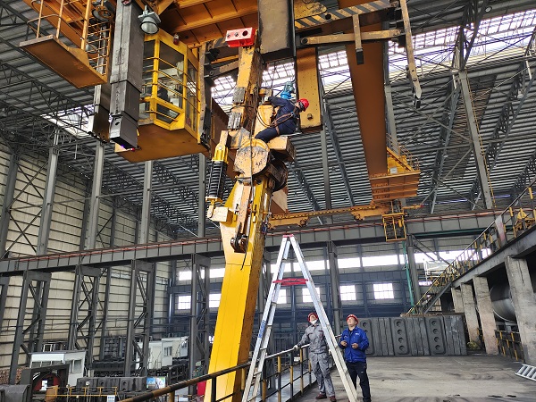 陽極分公司焙燒多功能天車是焙燒爐裝出陽極塊的主要設(shè)備,隨著使用年限的增加,天車夾具各機(jī)構(gòu)出現(xiàn)磨損變形情況,致使天車存在散爪安全隱患。 針對此項隱患,分公司高度重視,成立由設(shè)備管理部牽頭、焙燒車間專業(yè)技術(shù)人員配合的攻關(guān)小組,通過對天車夾具主要機(jī)構(gòu)磨損老化程度分析研判,明確故障原因及解決方案。設(shè)備管理部積極協(xié)調(diào),快速完成定制備件的采購供貨任務(wù),并聯(lián)系對接廠家專業(yè)技術(shù)人員現(xiàn)場指導(dǎo)。焙燒車間檢修技術(shù)人員協(xié)同配合,對天車夾具、中間拉桿、開啟機(jī)構(gòu)等設(shè)備進(jìn)行矯正修復(fù)更換。經(jīng)歷5天的拆除、修整、裝配及反復(fù)調(diào)試,于10月24日順利完成了#1多功能天車#2夾具的大修工作。 大修后的多功能天車夾具運行平穩(wěn)、機(jī)構(gòu)動作順暢可靠,有效提升了設(shè)備本質(zhì)安全性能,保證了自用極和代焙塊的裝出爐工作,也為分公司今后自主完成大型設(shè)備的安裝調(diào)試積累了豐富經(jīng)驗。  |