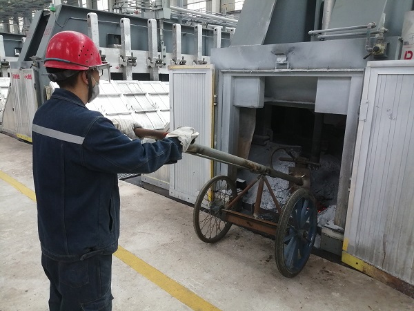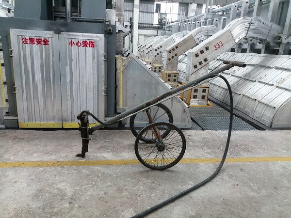 在500KA大型電解槽的前后兩端分別各有一個直徑約35-40公分的圓形洞口,主要用于鋁液吸出、炭渣打撈、物料添加、效應(yīng)熄滅、爐底勾帶等日常作業(yè),但是由于電解質(zhì)溶液的不斷凝固,需要定期對前后端洞口進(jìn)行擴(kuò)展維護(hù)。 日常作業(yè)時,作業(yè)人員需要使用手動風(fēng)鎬進(jìn)行擴(kuò)孔作業(yè),不但勞動強(qiáng)度大,而且需要長時間近距離貼近開孔處,存在一定的安全隱患。為消除隱患提高效率,在鋁鎂合金分公司電解一車間技術(shù)革新小組積極攻關(guān)下,一輛高效、簡便,可實現(xiàn)遠(yuǎn)距離操控的兩端頭開孔車于近日投入使用。該開孔車采用自行方式及杠桿原理,將手動風(fēng)鎬固定在開孔車前端,人工開孔距離擴(kuò)展至2米外,既保證了風(fēng)鎬開孔力度和擴(kuò)孔質(zhì)量,又減少了高溫輻射,勞動強(qiáng)度大幅度降低,開孔速度較以前也提高了3倍以上。 兩端頭開孔車的投入使用,是2024年電解一車間技術(shù)革新的首例成果,后續(xù),電解一車間技術(shù)革新小組將持續(xù)發(fā)揚工匠精神和創(chuàng)新精神,讓更多創(chuàng)新成果轉(zhuǎn)化為現(xiàn)實生產(chǎn)力。  |