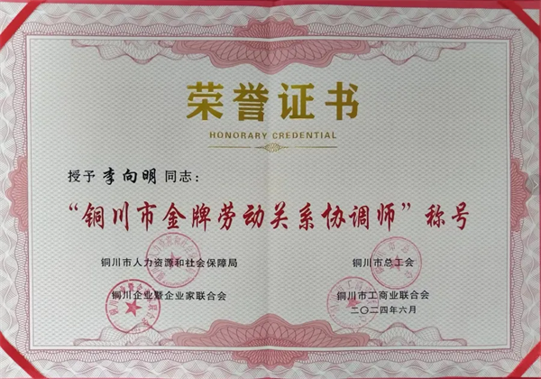 近日,銅川市人力資源和社會(huì)保障局、銅川市總工會(huì)等四部門聯(lián)合印發(fā)《關(guān)于認(rèn)定2024年度“銅川市金牌勞動(dòng)關(guān)系協(xié)調(diào)師”和“銅川市金牌協(xié)調(diào)勞動(dòng)關(guān)系社會(huì)組織”的通知》,公司人力資源部李向明被選樹為“銅川市金牌勞動(dòng)關(guān)系協(xié)調(diào)師”榮譽(yù)稱號(hào)。