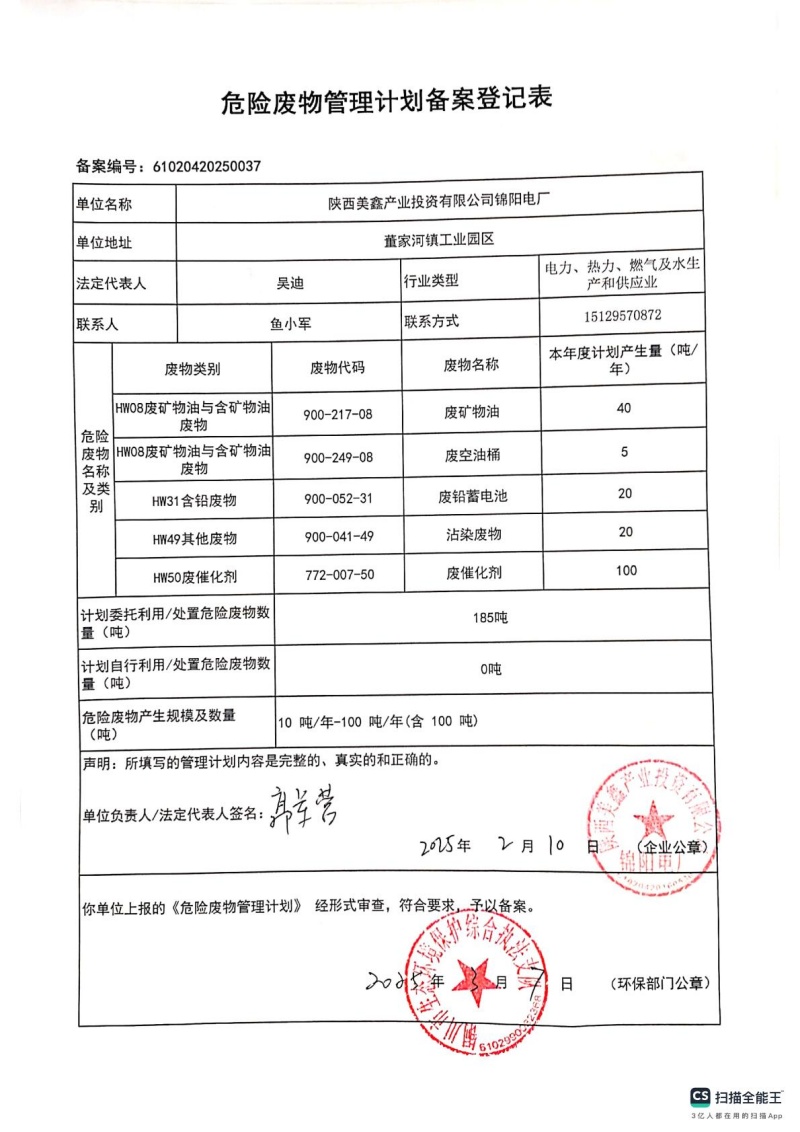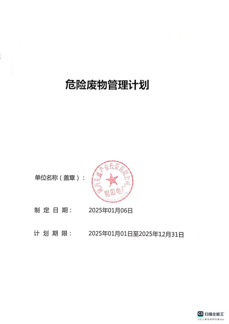 2025年危險(xiǎn)廢物管理計(jì)劃(錦陽電廠)
